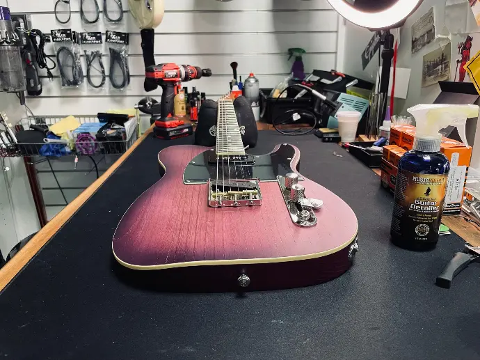 Laboratorio completo per setup e manutenzione di tutti gli strumenti (chitarre, batterie, percussioni). Per strumenti a fiato ci appoggiamo a specialisti esterni.